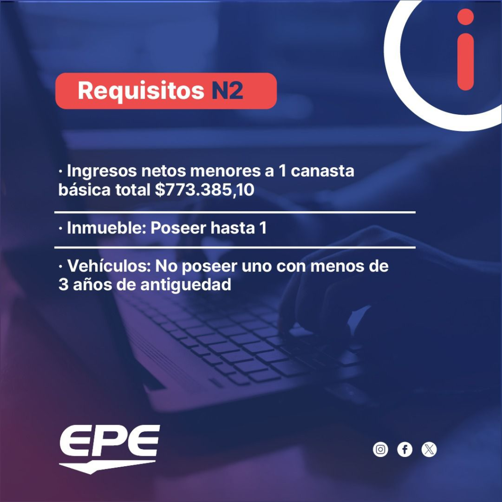 El grupo N2 está compuesto por quienes cuyos ingresos netos mensuales totales del hogar sean menores a una canasta básica total ($773.385,10), poseer hasta un inmueble y no contar con un vehículo con menos de tres años de antigüedad.