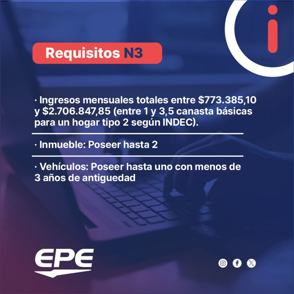 Por último, ingresarán en el grupo N3 quienes cuenten con ingresos mensuales totales entre 1 y 3,5 canastas básicas ($773.385,10 y $2.706.847,85), posean hasta dos inmuebles y un vehículo con hasta tres años de antigüedad.