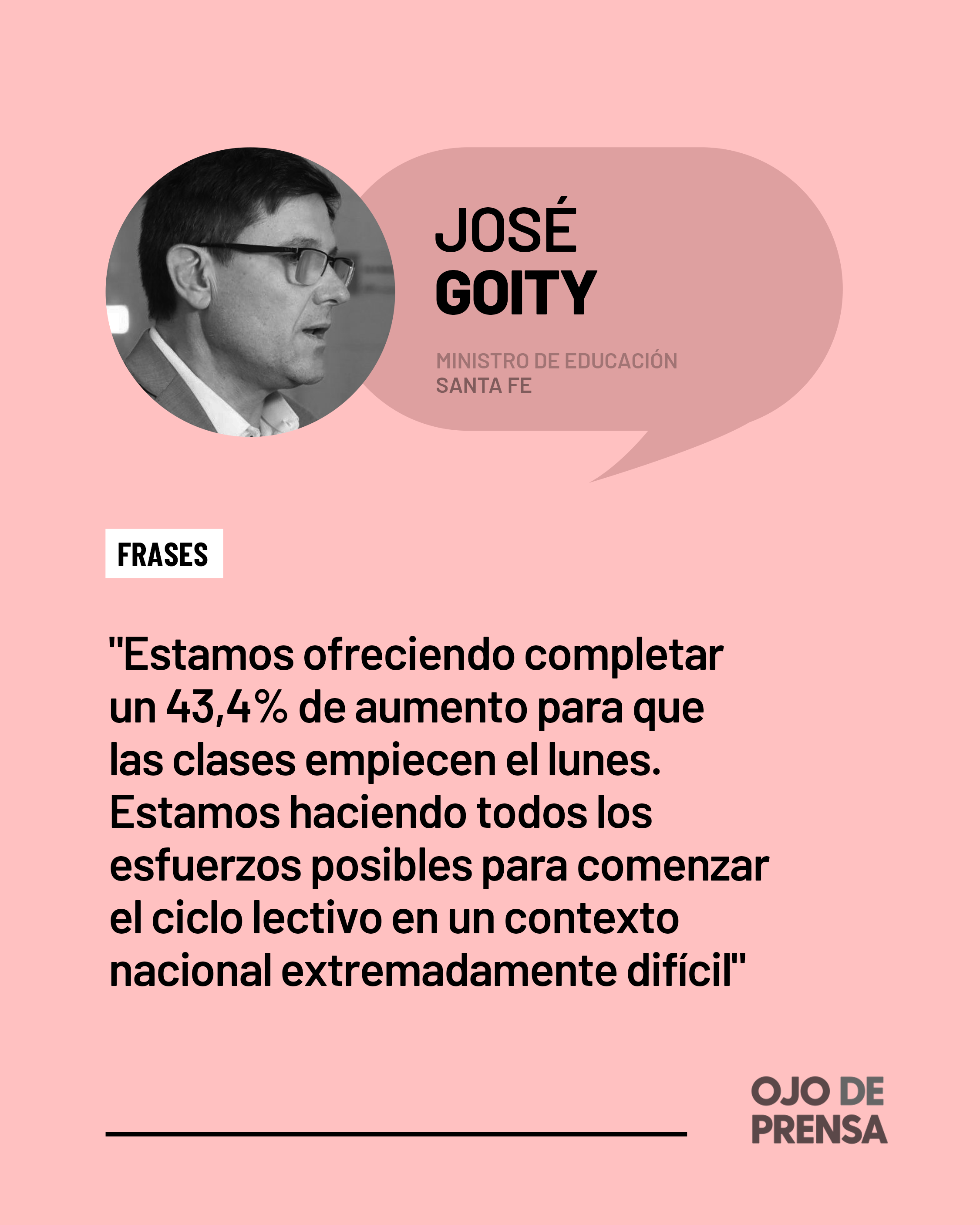El ministro de Educación, José Goity expresó que “este ofrecimiento reafirma el compromiso que pusimos sobre la mesa en la primera reunión paritaria el pasado 4 de enero de mejorar los salarios en base a los recursos disponibles. Estamos ofreciendo un incremento en lo que va del año del 43,6 % para que las clases empiecen el lunes”, sentenció.