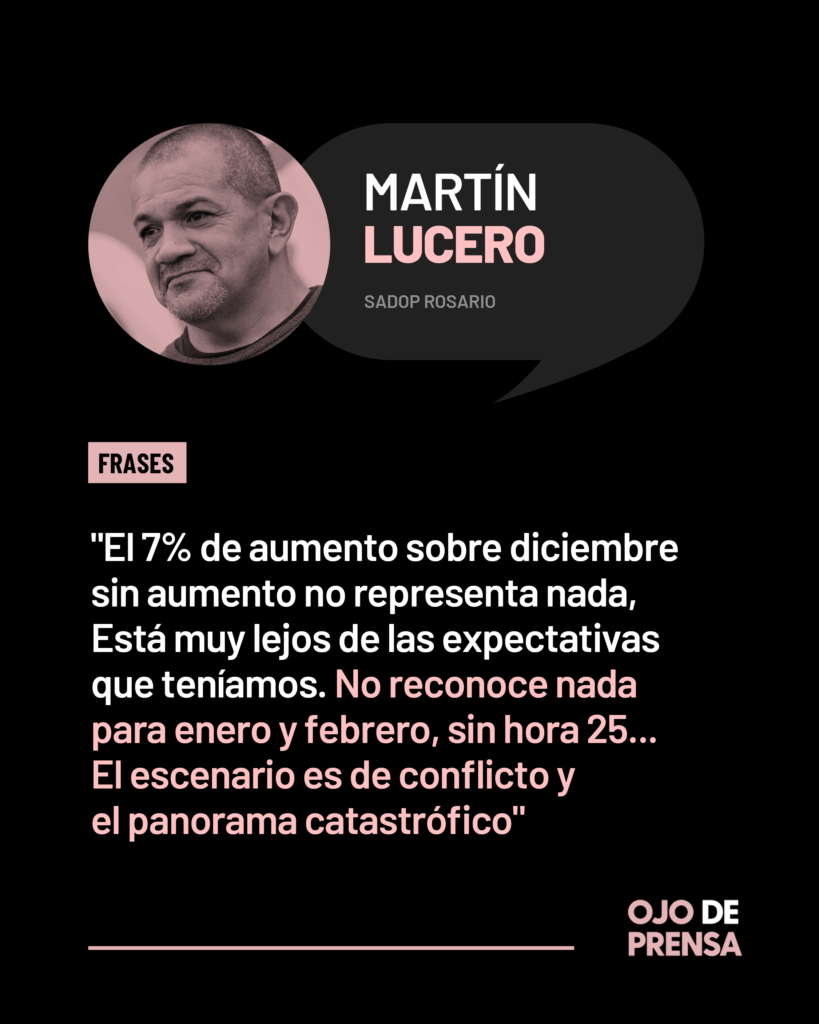«El 7% de aumento sobre diciembre sin aumento no representa nada, no vale ni una resma de hojas para carpeta. Está muy lejos de lo que esperábamos. No reconoce nada para enero y febrero; el escenario es de conflicto. El miércoles haremos reuniones informativas y el viernes tendremos una posición. El panorama es desalentador», manifestó el titular de Sadop Rosario, Martín Lucero, a la salida de la reunión.