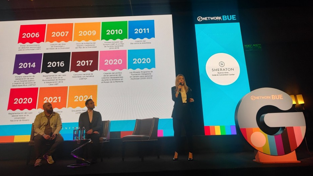 La funcionaria expuso las políticas y los hitos locales referidos a la diversidad tanto en turismo como en las diversas áreas municipales, recalcando así la gestión de la ciudad para que Rosario sea hoy un lugar seguro y elegido por las diversidades. Participaron de la presentación los creadores de contenido Agustín Barletta y Leo Saleh, quienes contaron sus experiencias en Rosario.