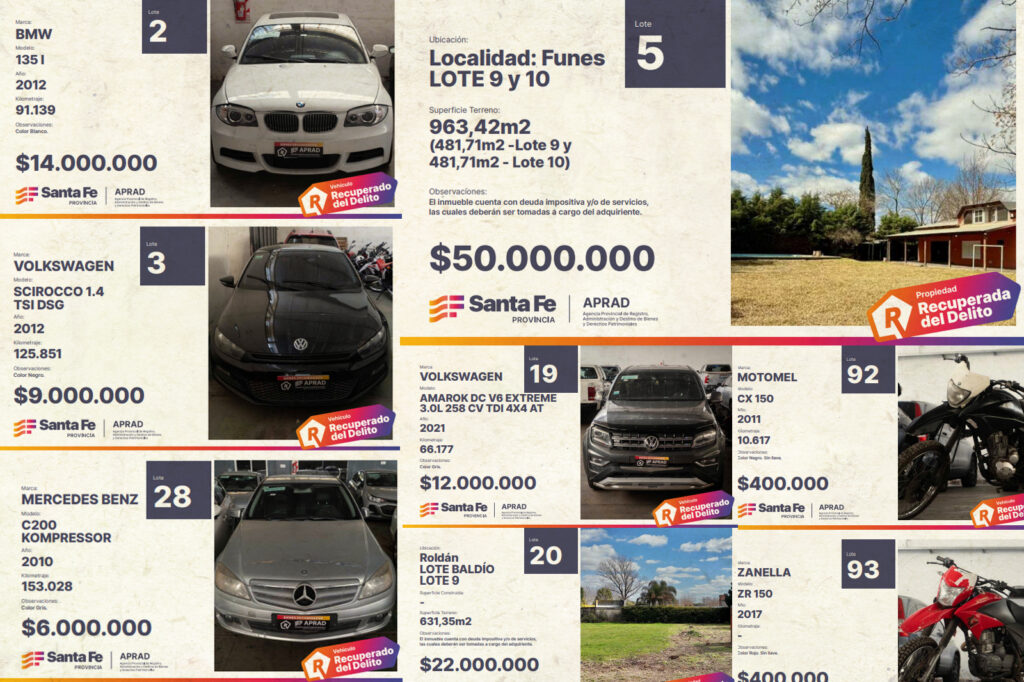 Por su parte, el director provincial de la Aprad, Martín Domene, detalló que entre los bienes disponibles figuran 62 vehículos (autos, motos, pick-ups y un cuatriciclo), tres lotes de joyas, 24 celulares en caja, electrodomésticos, materiales de construcción y cuatro inmuebles: tres terrenos en Roldán y un lote con vivienda en Funes. Según precisó, el valor total de las bases de los lotes asciende a 480 millones de pesos.