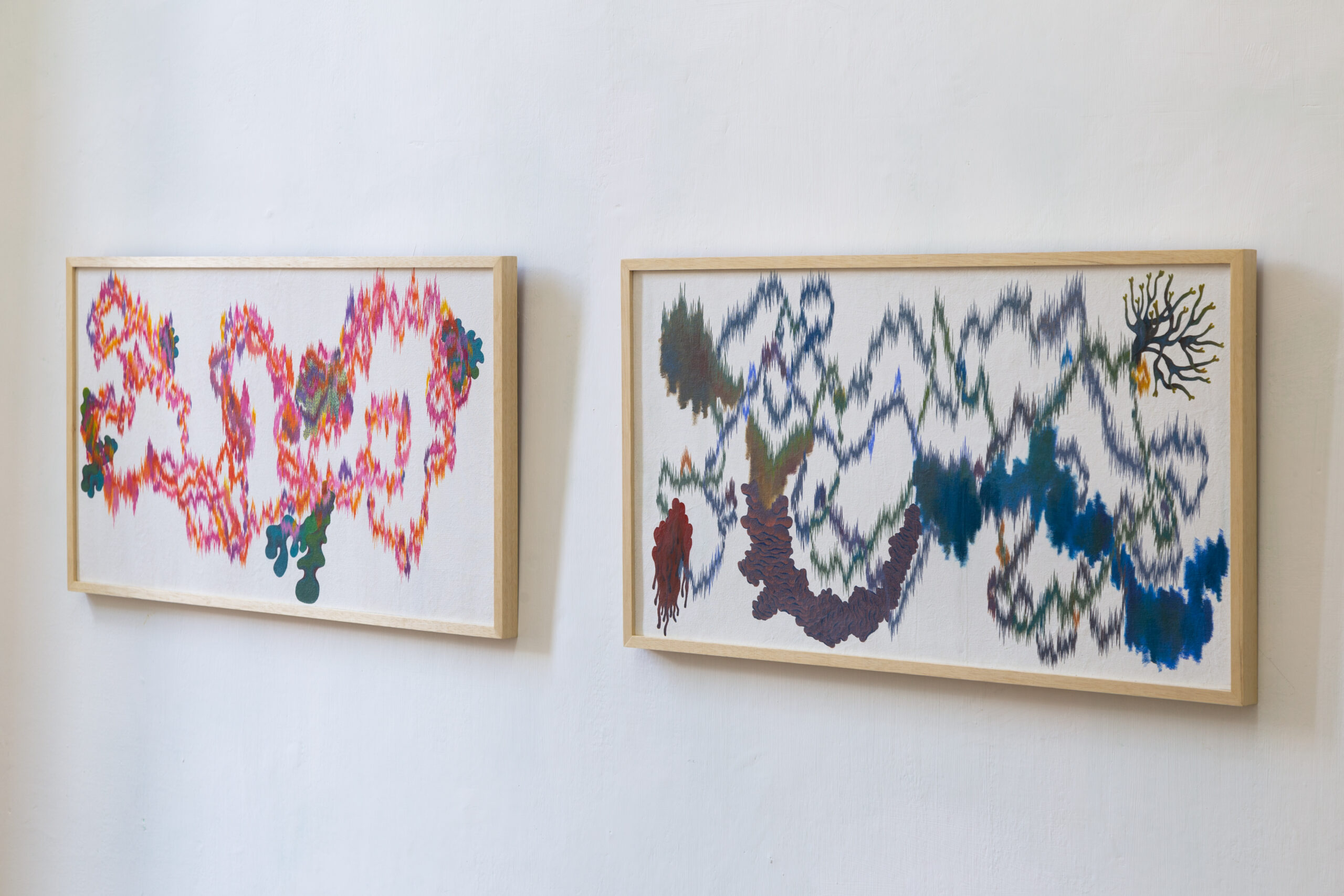 «Estas pinturas se presentan como la traducción de un paisaje donde el horizonte, las formas y el sonido parecen comprimirse en una serie de líneas intermitentes que remiten a interfaces virtuales de edición sonora. En el ejercicio de seguir la frecuencia que dibuja la línea, cada tanto, una forma se revela y se manifiesta como evaginación o apéndice distorsionado a modo de señalamiento semiótico», apuntaron desde Desmayo con las firmas de Mauro Guzmán y Nicolás Mareco, directores del espacio de arte.