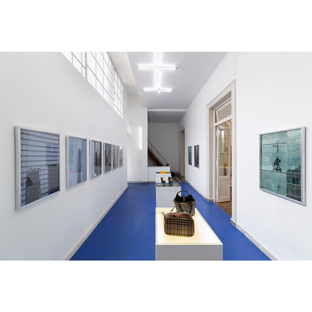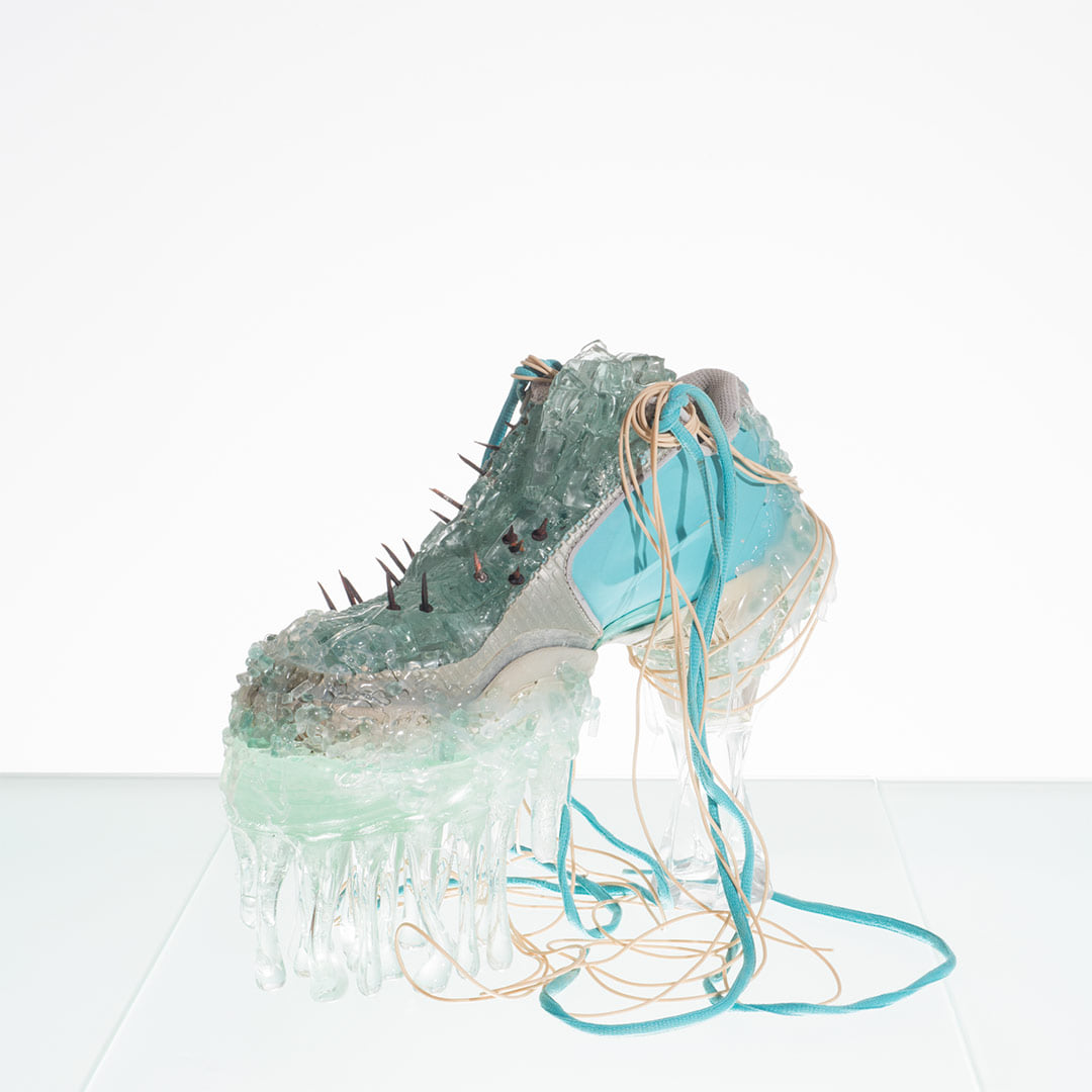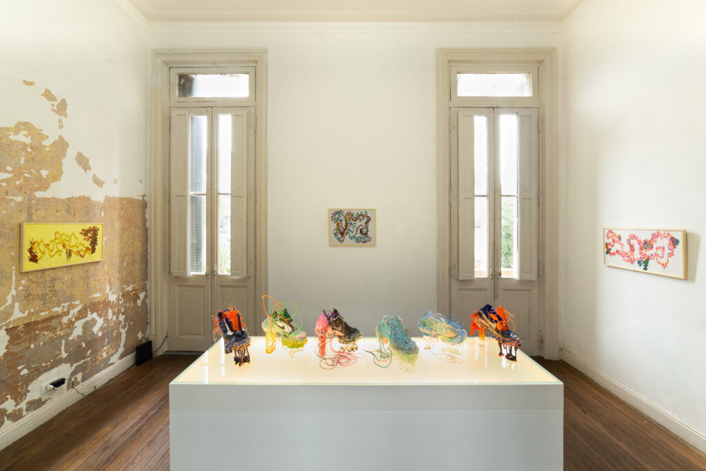 «Sandalia, frasco de perfume y vidrio fundido», «vidrio float, cordones, restos de zapatilla, tachas, frasco de perfume» bajo una técnica de chorreado en caída libre que combina con las fotografías de edificios y las pinturas de la artista rosarina Ayub Sgrosso que «experimentan el tiempo, la forma y el color en sus diferentes percepciones mutables».