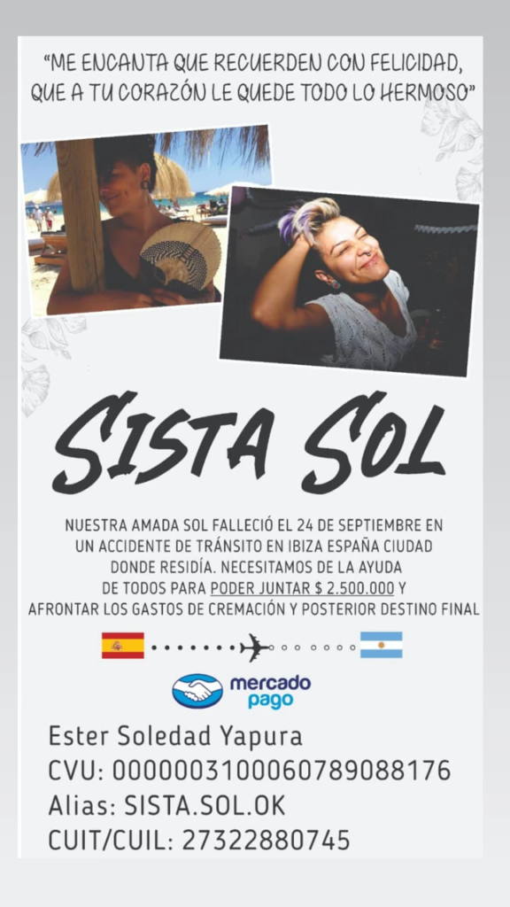 Sol Yapura era rosarina, vivía en Ibiza desde hacía varios años y el domingo fue atropellada en por un auto en Gorg Ses Feixes de Vila. Fue asistida, pero falleció en el hospital. La mujer tenía 35 años y presentaba heridas muy graves, por lo que fue trasladada a la Policlínica Nuestra Señora del Rosario, centro donde ingresó en la Unidad de Cuidados Intensivos (UCI) y murió a las pocas horas.
