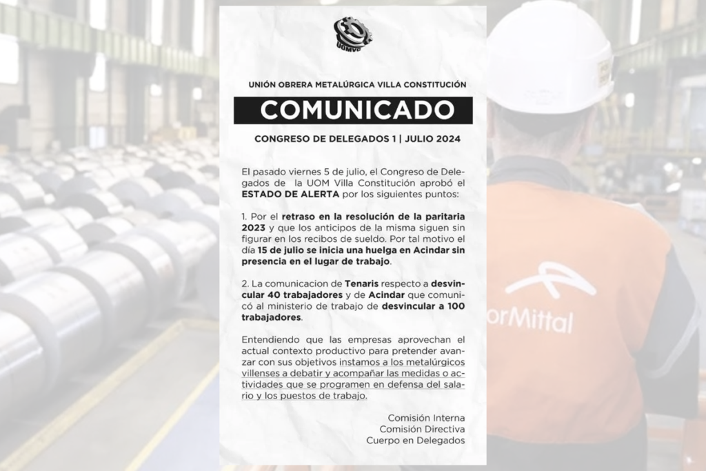 «Entendido que las empresas aprovechan el actual contexto productivo para pretender avanzar con sus objetivos, instamos a los metalúrgicos villenses a debatir y acompañar las medidas o actividades que se programen en defensa del salario y los puestos de trabajo», culmina el comunicado lanzado por la UOM. El paro se circunscribe sólo sobre la planta de Villa Constitución.