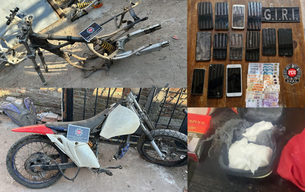 En domicilios de la zona norte de Rosario, la PDI incautó 15 motocicletas incompletas, diversas autopartes, tres teléfonos celulares, una vaina servida calibre 9 milímetros y una gorra, todos elementos puestos a disposición del MPA.
