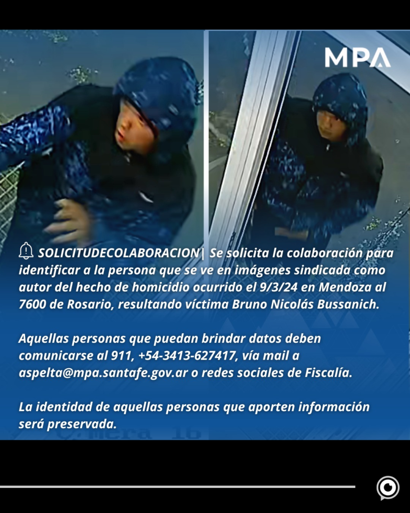 La Fiscalía Regional Segunda Circunscripción solicita la colaboración de la población para dar con la persona que se observa en las imágenes. La persona se encuentra sindicada como autor del homicidio donde resultó víctima Bruno Nicolás Bussanich, de 25 años, perpetrado el sábado por la noche en la zona de Mendoza al 7600 de la ciudad de Rosario.