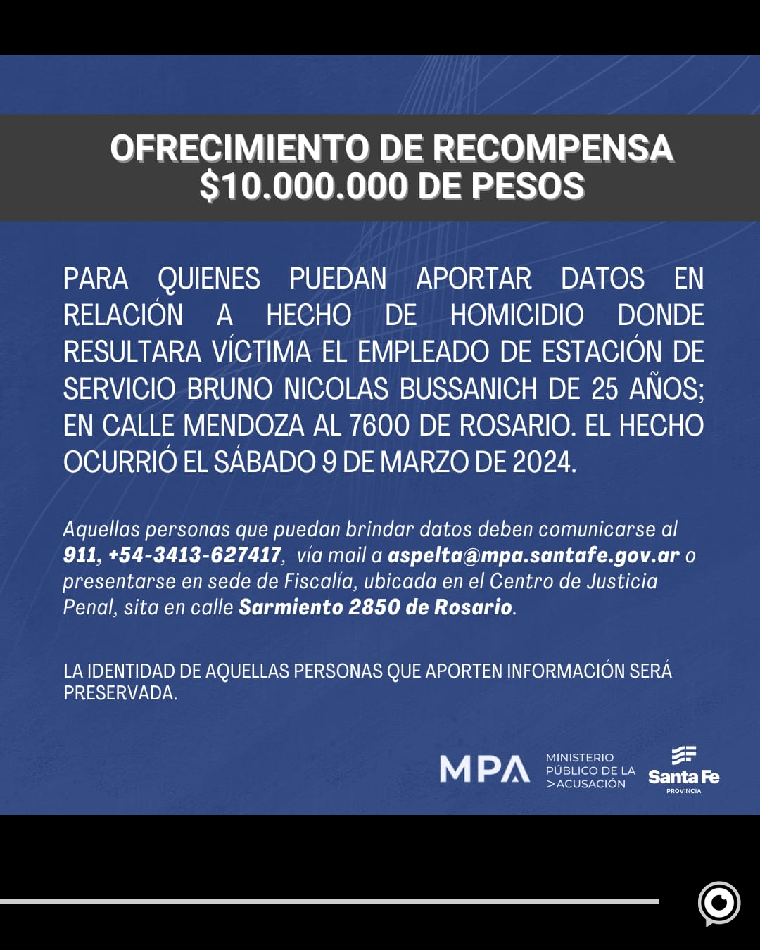 A su vez, el Gobierno de Santa Fe ofrece una recompensa de $10.000.000 (diez millones de pesos), para quienes aporten datos en relación a hecho de homicidio donde resultara víctima el empleado de estación de servicio.