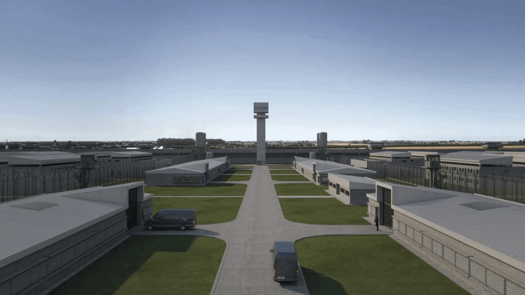 Detalles de la obra. La nueva Cárcel de Alto Perfil tendrá características edilicias particulares y estará compuesta por 4 minipenales y un edificio de gobierno general, por donde se realizará el ingreso. Tendrá un doble muro perimetral de 1.800 metros de largo por 10 metros de alto, con circulación vehicular por debajo y circulación peatonal por arriba. Además, cada 70 metros tendrá un torreón de vigilancia. En el fondo del penal habrá una torre de 36 metros de alto para tener una vista de 360 grados.
