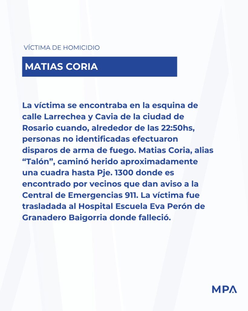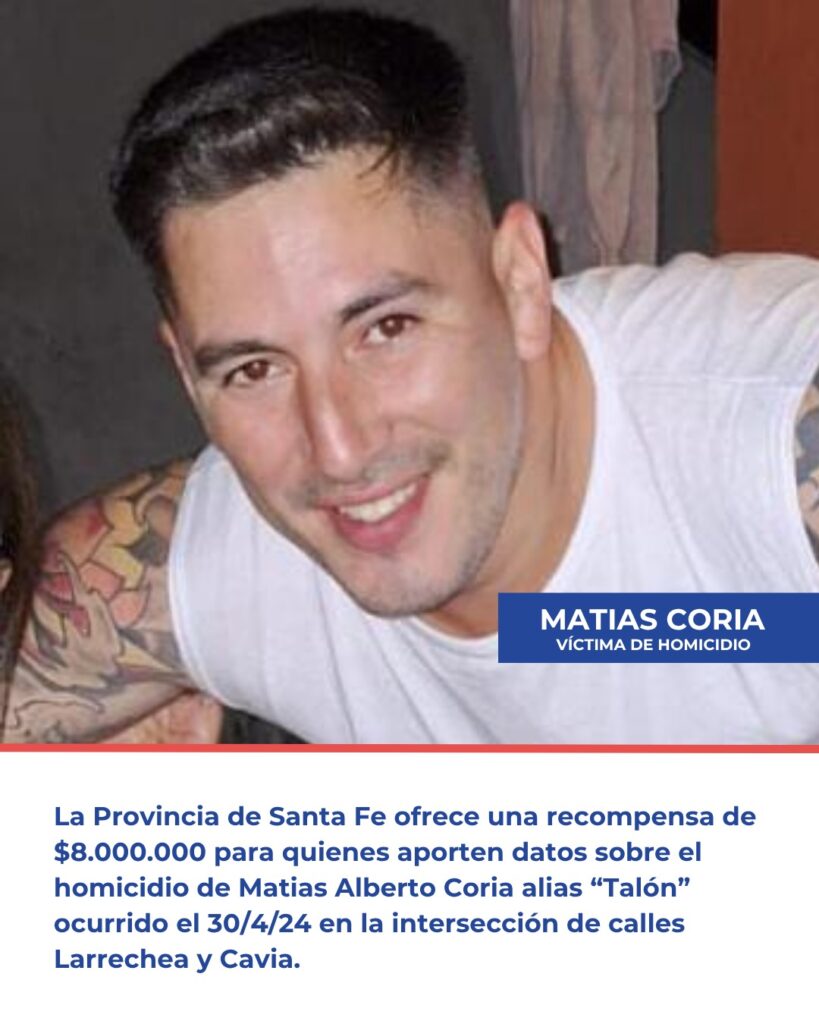 La Fiscalía de Homicidios del Ministerio Público de la Acusación (MPA) solicita colaboración ciudadana para esclarecer el asesinato de Matías Alberto Coria, ocurrido el 30 de abril de 2024 en la zona norte de Rosario. Como parte de la investigación, se dispuso una recompensa de 8 millones de pesos para quienes puedan aportar datos útiles, relevantes y decisivos que permitan identificar al autor del hecho.