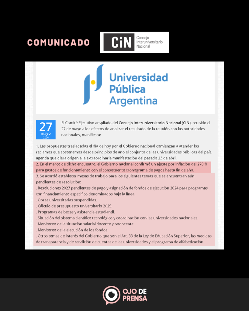 El Comité Ejecutivo ampliado del Consejo Interuniversitario Nacional (CIN), reunido el 27 de mayo a los efectos de analizar el resultado de la reunión con las autoridades nacionales, manifiesta: