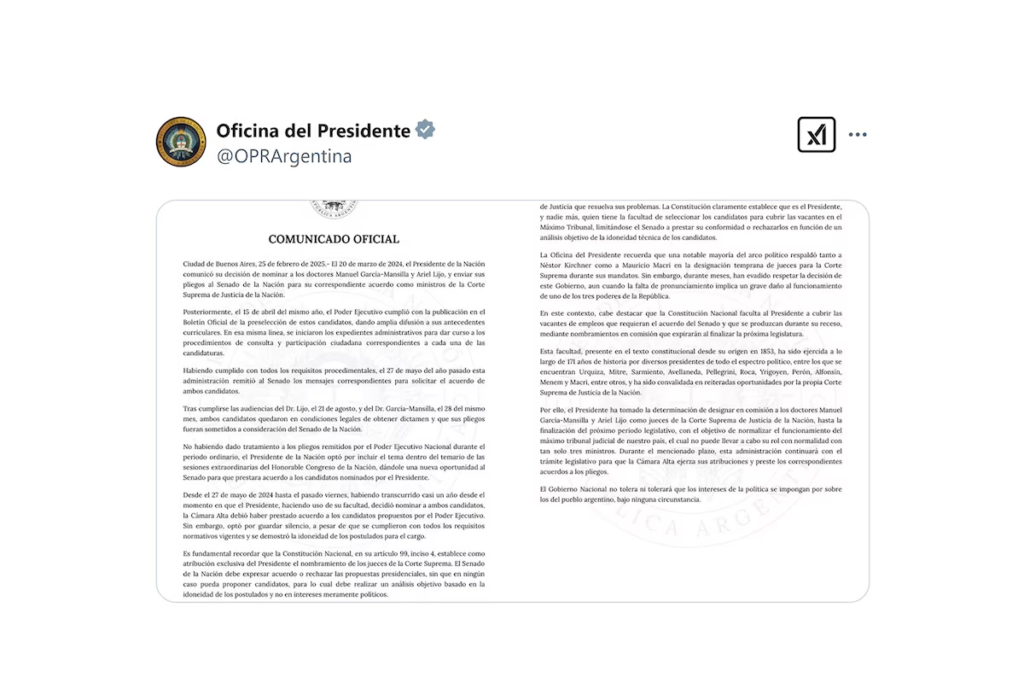 En la misma línea, Presidencia destacó que durante este período de transición se continuará con el trámite legislativo para que el Senado emita los acuerdos correspondientes. “El gobierno nacional no tolerará que los intereses políticos prevalezcan sobre los del pueblo argentino en ningún caso”, afirmó el texto difundido.