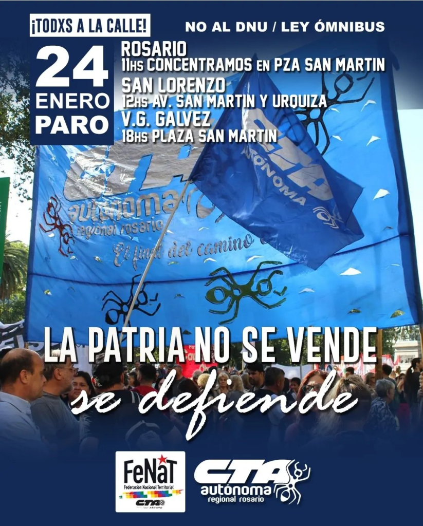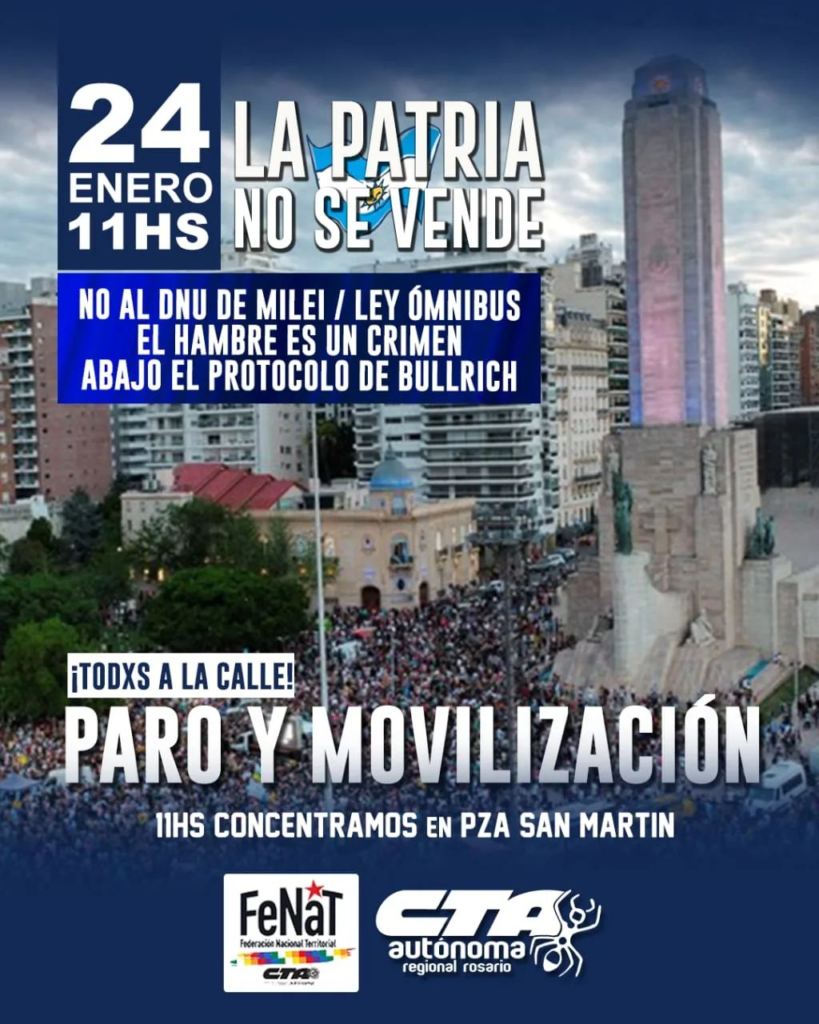 El Movimiento Sindical Rosarino (MSR) llamó a movilizar en rechazo al decreto de necesidad y urgencia (DNU) y a la ley Ómnibus que «destruye los valores constitucionales que hacen posible la convivencia entre los argentinos y argentinas”. Los gremios del MSR convocan a concentrar desde las 11.30 en la plaza 25 de Mayo, frente a la Municipalidad de Rosario.