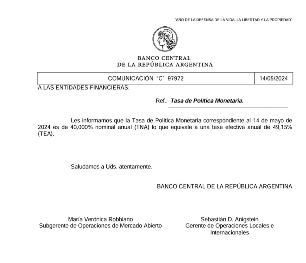 Tras la publicación del informe de Indec con la inflación de abril (8,8%), el Banco Central de la República Argentina (BCRA) volvió a bajar la tasa de interés de política monetaria, reduciéndola diez puntos porcentuales, al 40% nominal anual. De acuerdo con lo informado por la entidad a través de la Comunicación «C 97972», la tasa efectiva anual pasó a ser ahora de 49,15%.