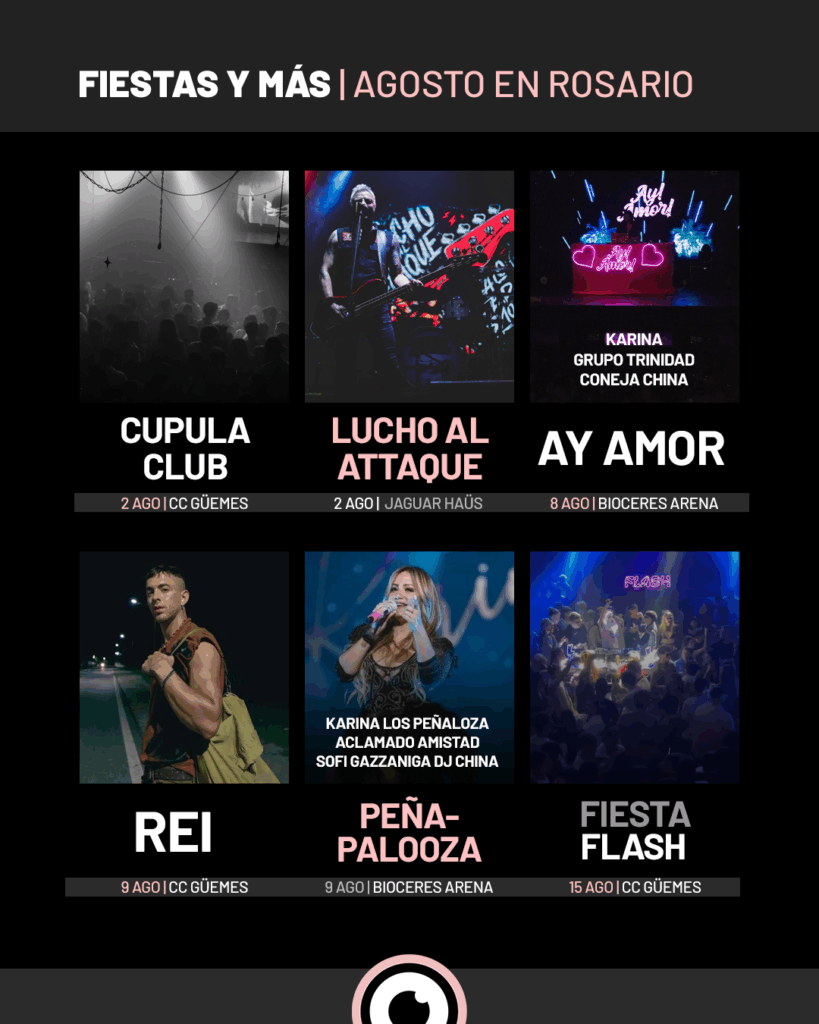 Las noches rosarinas completan la escena con fiestas de todo tipo y una movida electrónica cada vez más potente, con DJs internacionales, pistas dobles y propuestas que van desde lo alternativo hasta los sonidos más mainstream. Con funciones y recitales en espacios emblemáticos como el Astengo, El Círculo, La Comedia y el Broadway, y una agenda musical que toma fuerza en lugares como Bioceres Arena, Galpón 11, el Centro Cultural Güemes y The Warehouse, agosto en Rosario es una invitación a salir y disfrutar.