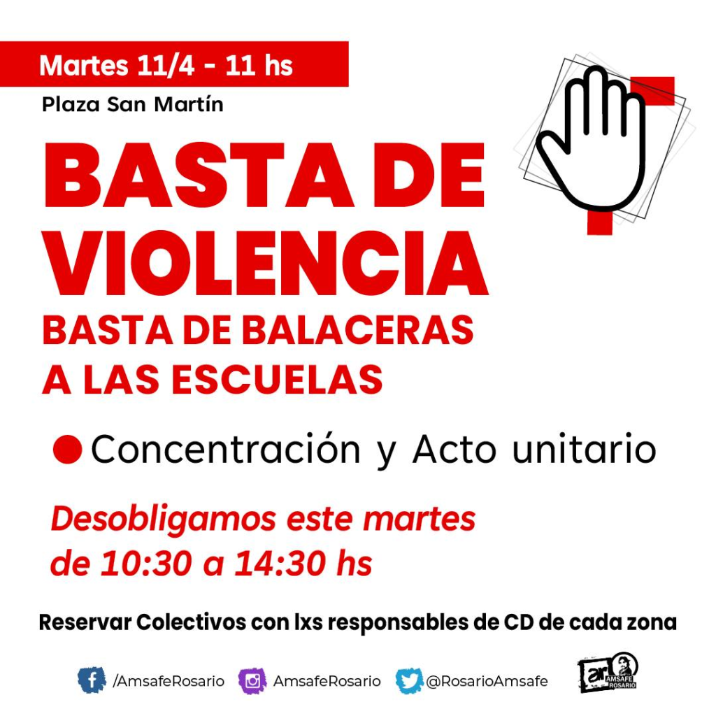 «Basta de violencia, Basta de balaceras a las escuelas», es la consigna de Amsafe Rosario para este martes. La concentración será a las 11 en Plaza San Martín, donde se realizará un acto. En ese marco, se desobligará a los alumnos entre las 10.30 y las 14.30.