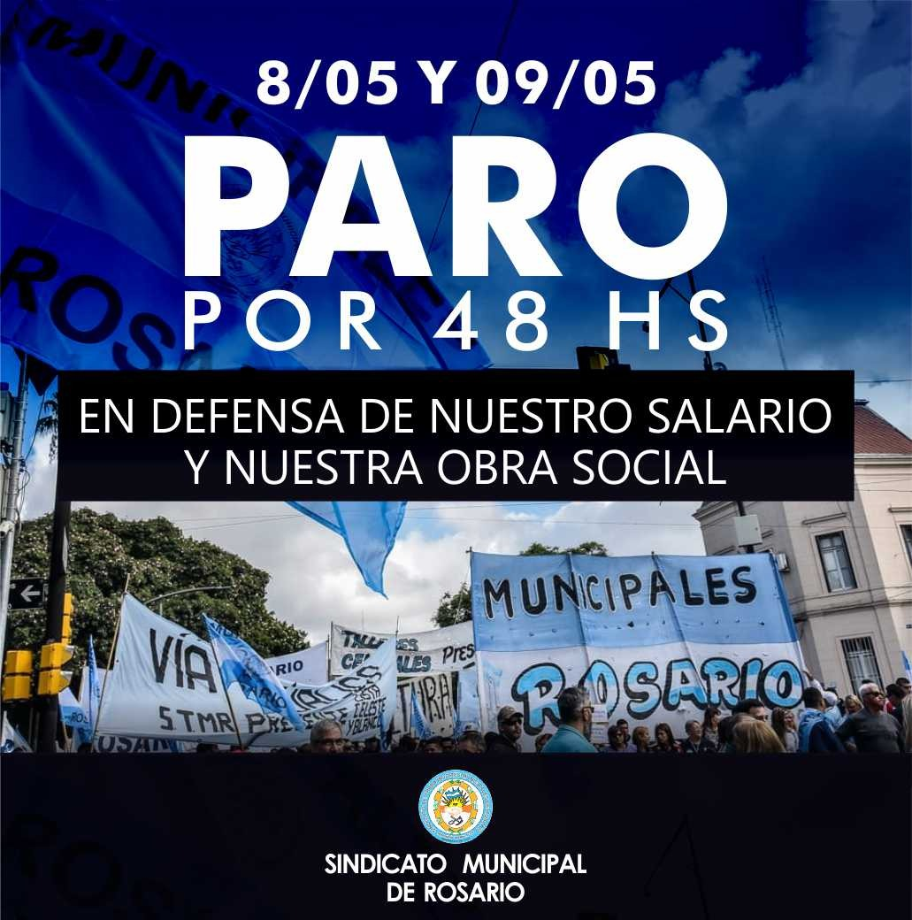 Los trabajadores municipales de Rosario anunciaron un paro para este miércoles 8 y jueves 9 de mayo por el reclamo de una recomposición salarial correspondiente al mes de abril. La medida fue votada en asamblea y confirmada por el secretario general del gremio que los nuclea, Antonio Ratner. El plan de lucha incluye una movilización el miércoles frente a Iapos para reclamar por la falta de respuestas de la obra social.