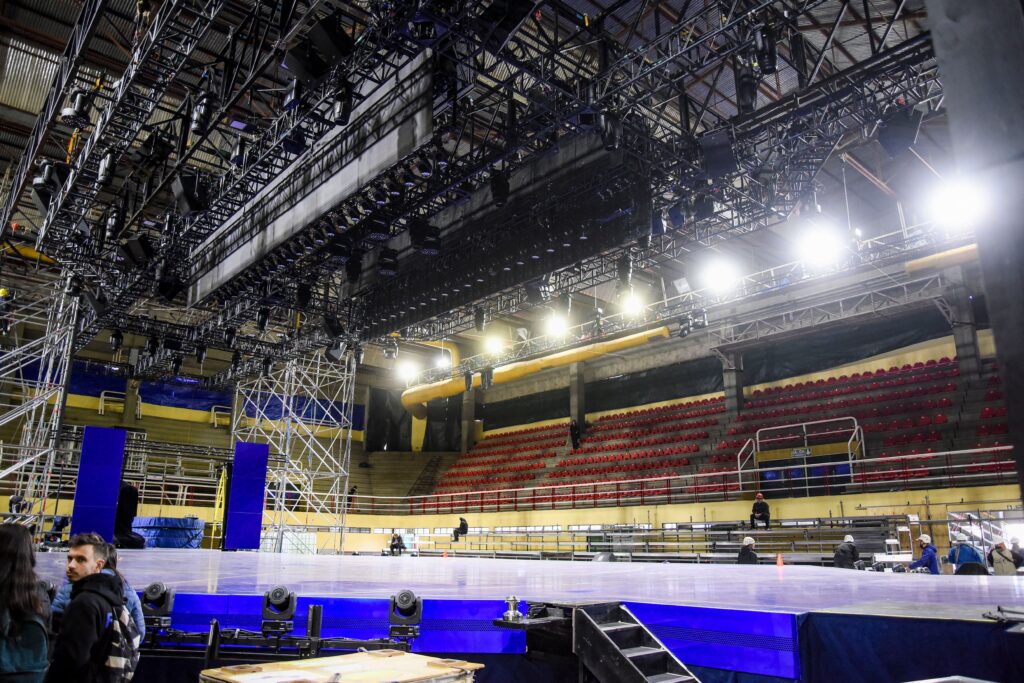 - Previo al inicio de la conferencia se realizó un recorrido por el estadio que se encuentra en la última instancia de armado. El escenario, diseñado como una cancha de fútbol reimaginada, mide 41 metros de largo por 14 de ancho. La mega escenografía cuenta con pantallas móviles de alta definición y un grid de 23 toneladas que sostiene equipos de luces, video y audio.