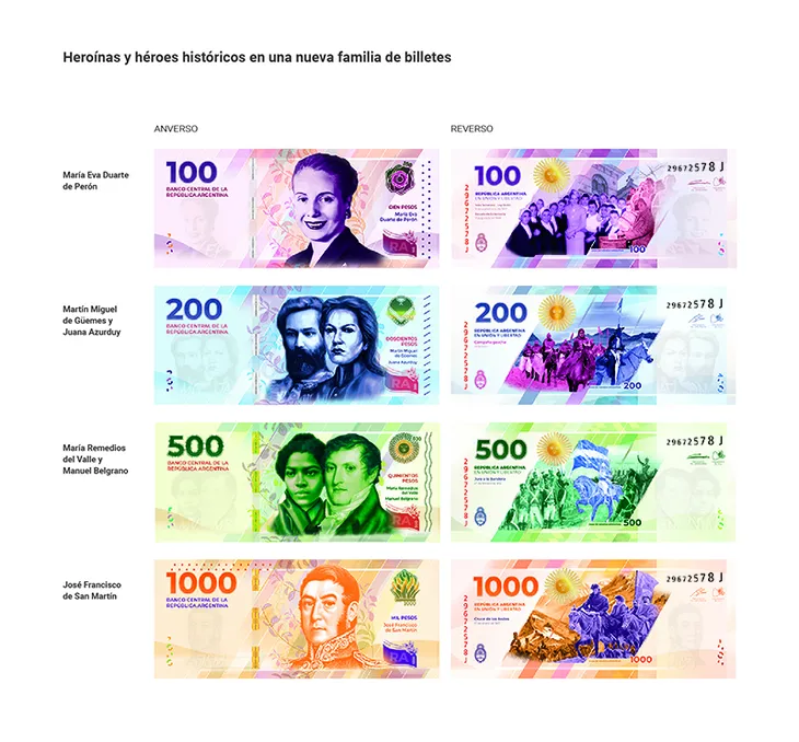 De esta manera, gradualmente, así como San Martín reemplazará al hornero en el billete de $1.000, Martín Miguel de Güemes y Juana Azurduy se convertirán en los protagonistas del de $200, desplazando a la ballena franca austral del diseño actual, y María Remedios del Valle se sumará a Manuel Belgrano en el de $500, ya que este último es la figura que ilustra el primer diseño de ese papel, y el del yaguareté se dejará de imprimir.